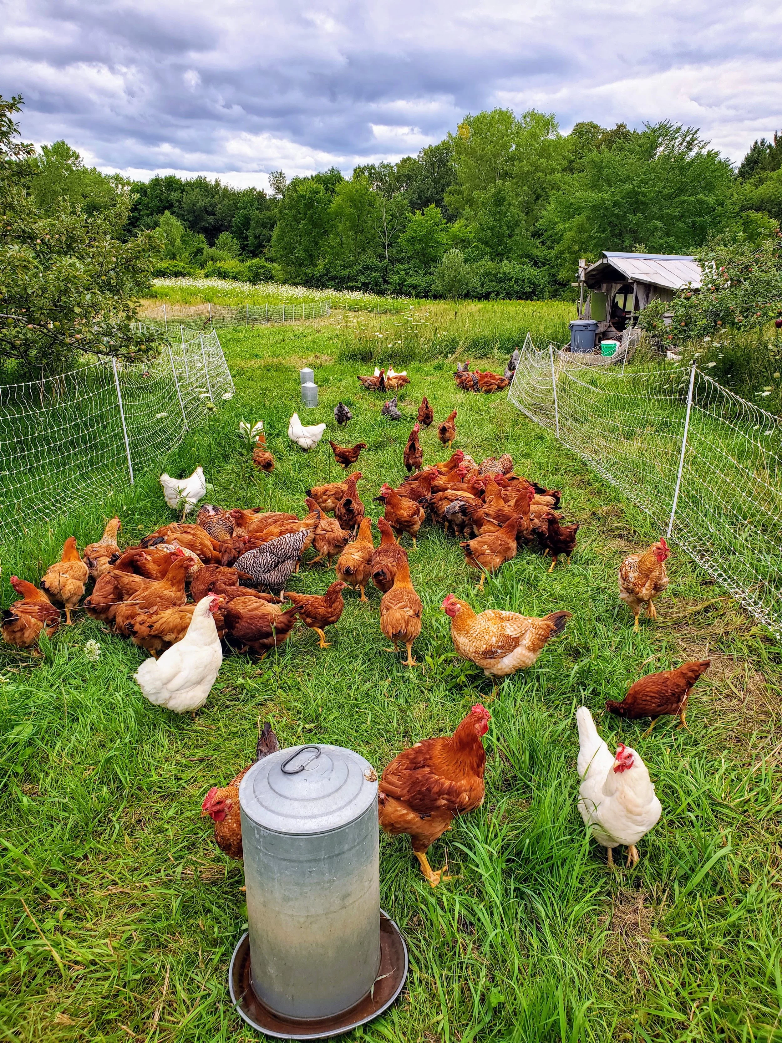 Our chickens are our main fertilizers. They are rotated on the farm fields after we have harvested all the produce as well as the cover crops areas. Their coop is moved everyday. They are free to roam large areas where they scratch the soil and find their tasty bugs. We raise chickens for eggs. You can find eggs at the farm store.